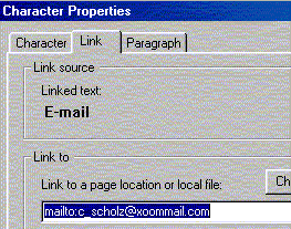 2. Highlight your text. "E-mail". 3. Click on the Link button 4. In Link to box type in mailto: followed by your e-mail address. NOTE: No spaces between any text in the mailto line. |