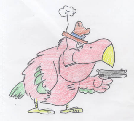 Mr.Parrot Cowboy is saying 'Stickem up!' with his gun.