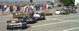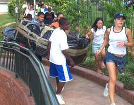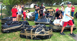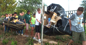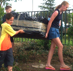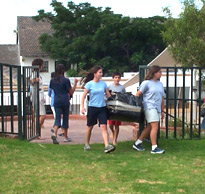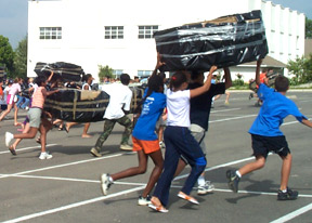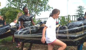 Each team carries their raft along the course to gain points based on their order of arrival at the pool.