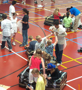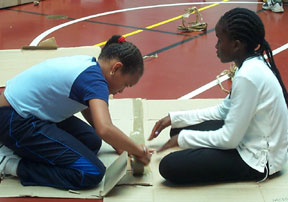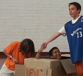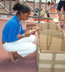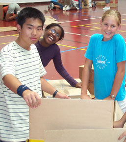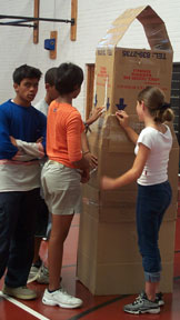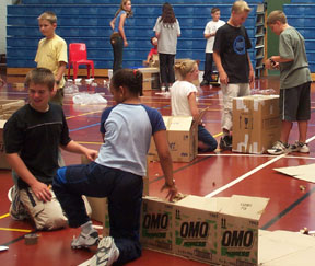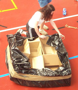Each team constructs their own raft, using boxes, two rolls of tape and a piece of black plastic. The team cooperates on design and building. |