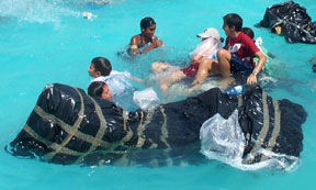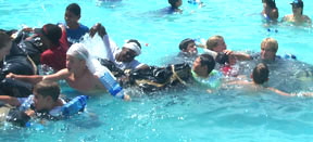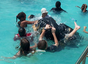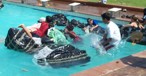 Each raft that successfully floated across the length of the pool was part of the melee. The members had to sink the other rafts and see which raft was the last . Awards were given to the top three teams earning the most points.
